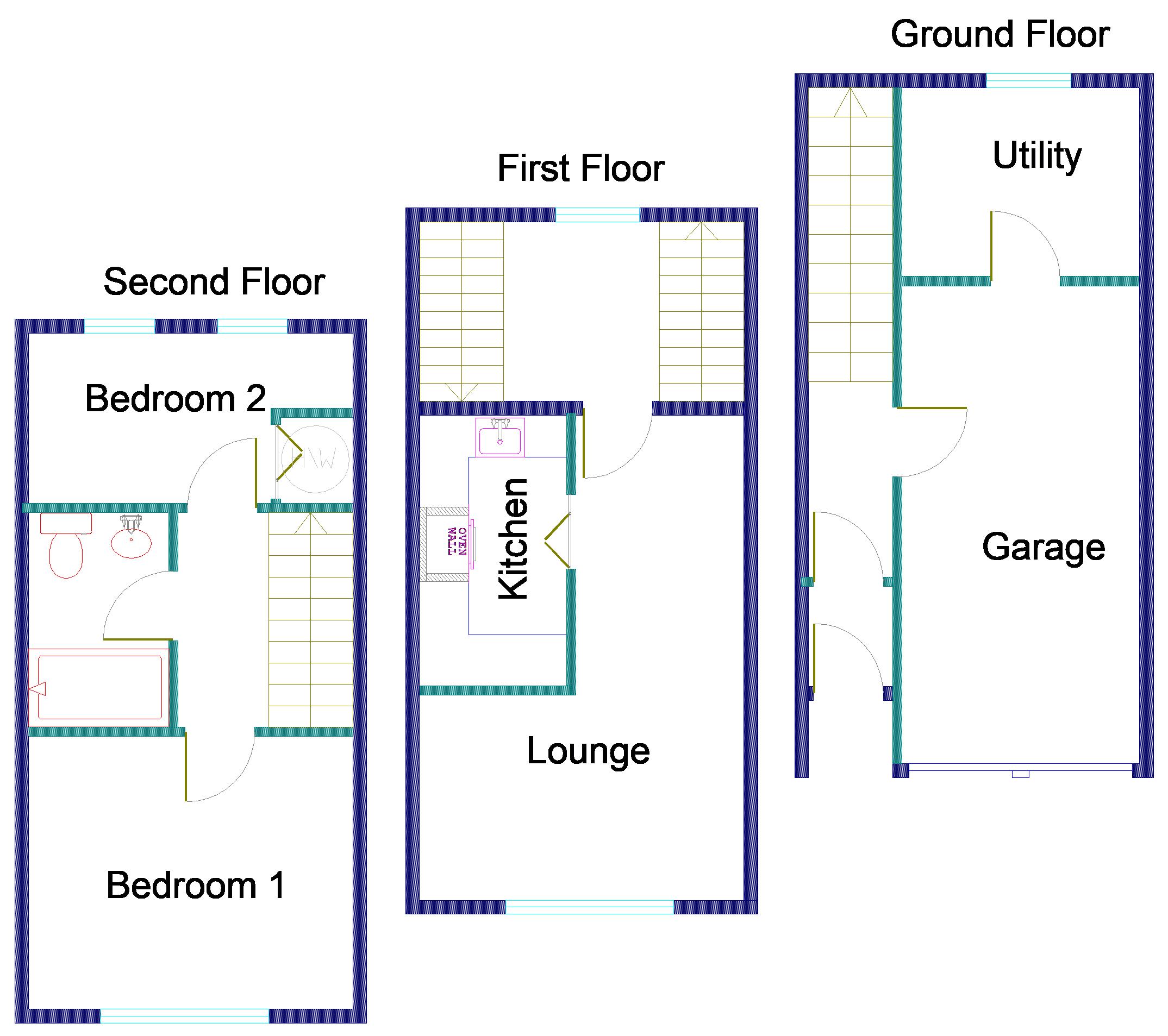 Entrance to the property is via an Elizabethan style panel glazed door to an inner vestibule with a hardwood panel glazed door leading to a hallway having ceramic tiled flooring and a door off to the: Garage 16 11 x 8 6 With an up and over door, electricity power points and lighting. Door off to: Utility Room 7 7 x 6 9 Having plumbing and space for washing machine and dryer. Double glazed window to the rear. Stairs to first floor landing with hand rail. Window to rear. Door off to: Lounge 17 4 x 11 7 With a twin opening double glazed window overlooking the front of the property. Economy 7 night storage heater. B.T. Telephone point and T.V. aerial socket. Space for a table and chairs. Timber laminate flooring. Doorway into the: Kitchen Fitted with a range of new single and double opening wall and floor mounted storage cupboards having roll top work surfaces over with tiling to rear. Fitted electric oven and hob. Space for fridge/freezer. Stainless steel twin sink unit and drainer with mixer tap. Wall mounted extractor fan. Stairs to second floor landing with access to an insulated loft space. Doors off to: Bedroom 1 10 6 x 9 9 Having a double glazed twin opening window overlooking the front of the property. Fitted mirror door wardrobes. Electric night storage heater. Bedroom 2 11 8 x 6 1 With built in airing cupboard housing the hot water boiler and Economy 7 control panel. Electric wall mounted storage heater. Two single opening skylights. Bathroom Fitted with a new white coloured suite comprising of a panelled bath with electric shower over. Pedestal wash hand basin. Low flush toilet. Tiling to splash areas. Wall mounted extractor fan. Ceramic tiled flooring. Outside: One allocated parking space Services: All main services connected except gas. Council Tax: Band C. EPC: D-63 Maintenance Charge: We believe there is a maintenance charge to cover building insurance and maintenance to the outside of the property and the communal walkways. We believe this charge is currently £85 pcm. |